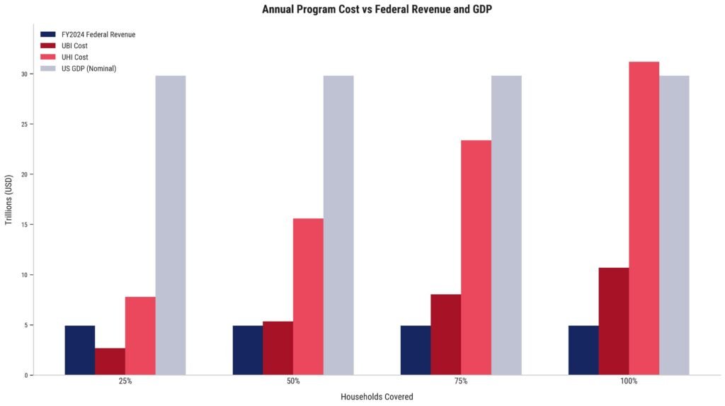 The chart below (Figure 1) shows annual cost if UBI or UHI is paid to 25%, 50%, 75%, or 100% of US households. Coverage is included to show scale and sensitivity. It is not a policy recommendation.